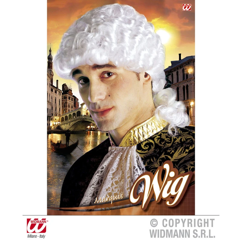 Parrucca marchese colore bianco con boccoli e codino con nastrino nero.