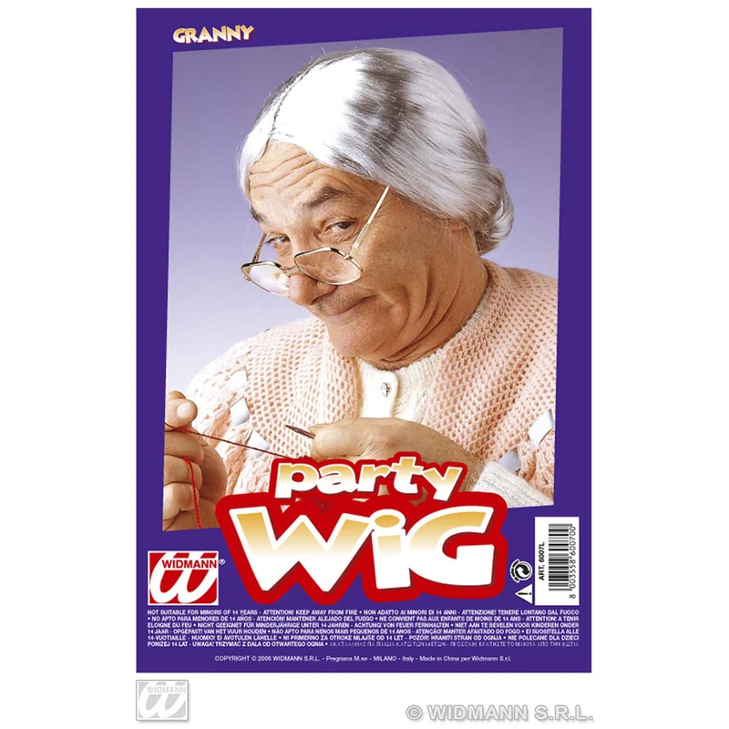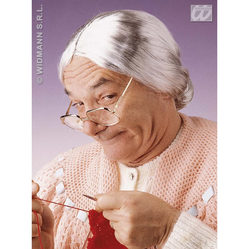 Parrucca modello NONNINA con capelli lisci grigio argento con riga centrale senza frangia raccolti in una cipolla bassa. Non piastrabile ne fonabile. Media qualità. Misura unica.