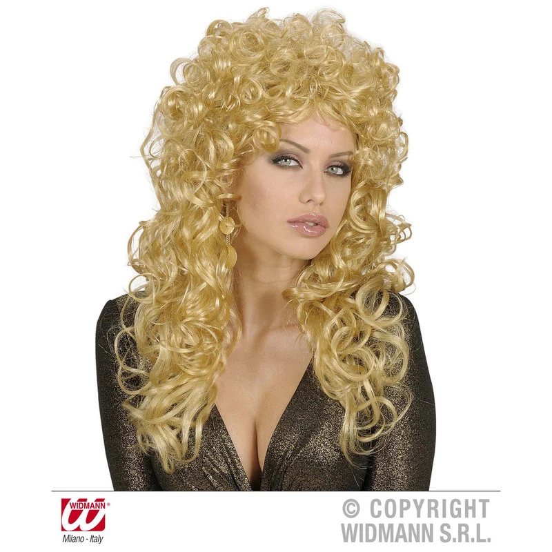 Parrucca modello RICCIOLONA lunga fino sotto alle spalle molto voluminosa con ricci ben definiti. Colore biondo chiaro. Non piastrabile ne fonabile. Media qualità. Misura unica.