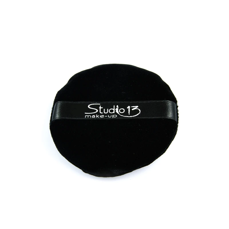 Piumino in cotone, morbido e di colore nero, con un nastro di raso per facilitare la presa e l’utilizzo durante la stesura di ciprie e altri prodotti per fissare il trucco. Diametro 10cm.