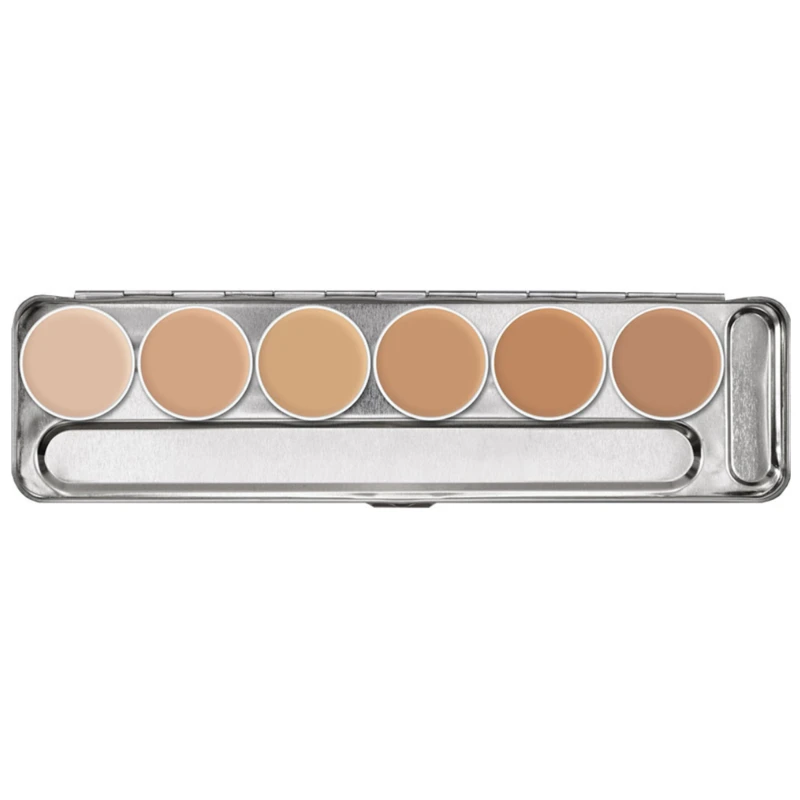 Rubber Mask Grease in una pratica palette. Rubber Mask Grease è un prodotto a base grassa d’eccezionale opacità ed aderenza. Il prodotto è l’ideale per colorare protesi in lattice come nasi artificiali, menti, ferite o calotte. I colori di questa palette possono essere sostituiti singolarmente con le cialde di ricambio. Per applicare uniformemente il prodotto inumidire la spugna con un po’ di alcol (es. con Spirit Gum Remover and Thinner). In questo modo Rubber Mask Grease consente un’applicazione uniforme, facile e persino sottile. Come gli altri Make-up a base grassa, Rubber Mask Grease andrebbe fissato con la cipria Traslucent Powder.